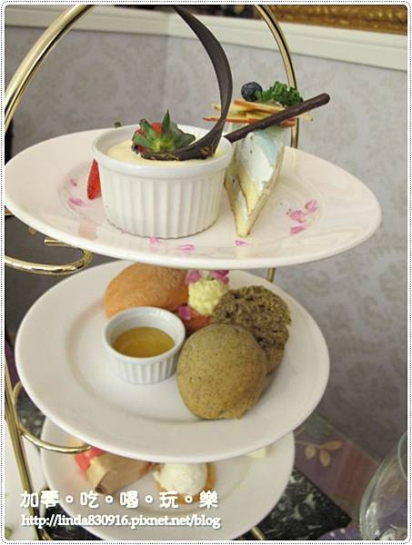 三層都是英式點心,有甜點、司康、三明治、蛋糕、米布丁...等